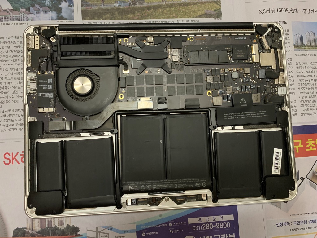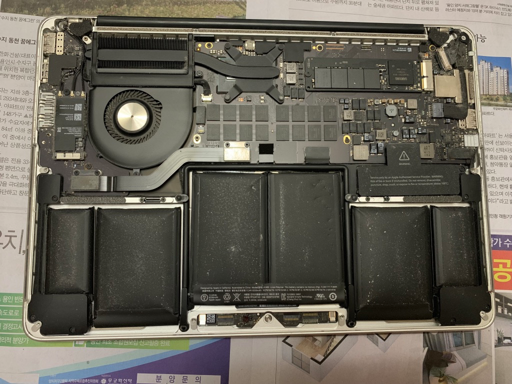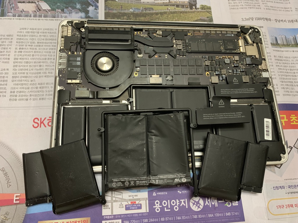 맥북프로 하단 기판을 열어보니, 어머나, 배터리가 엄청 많이 부풀어올랐군요. 생각보다 많이 부풀어 올라서 계속 나두었으면 큰일날뻔 한 생각이 들었습니다.