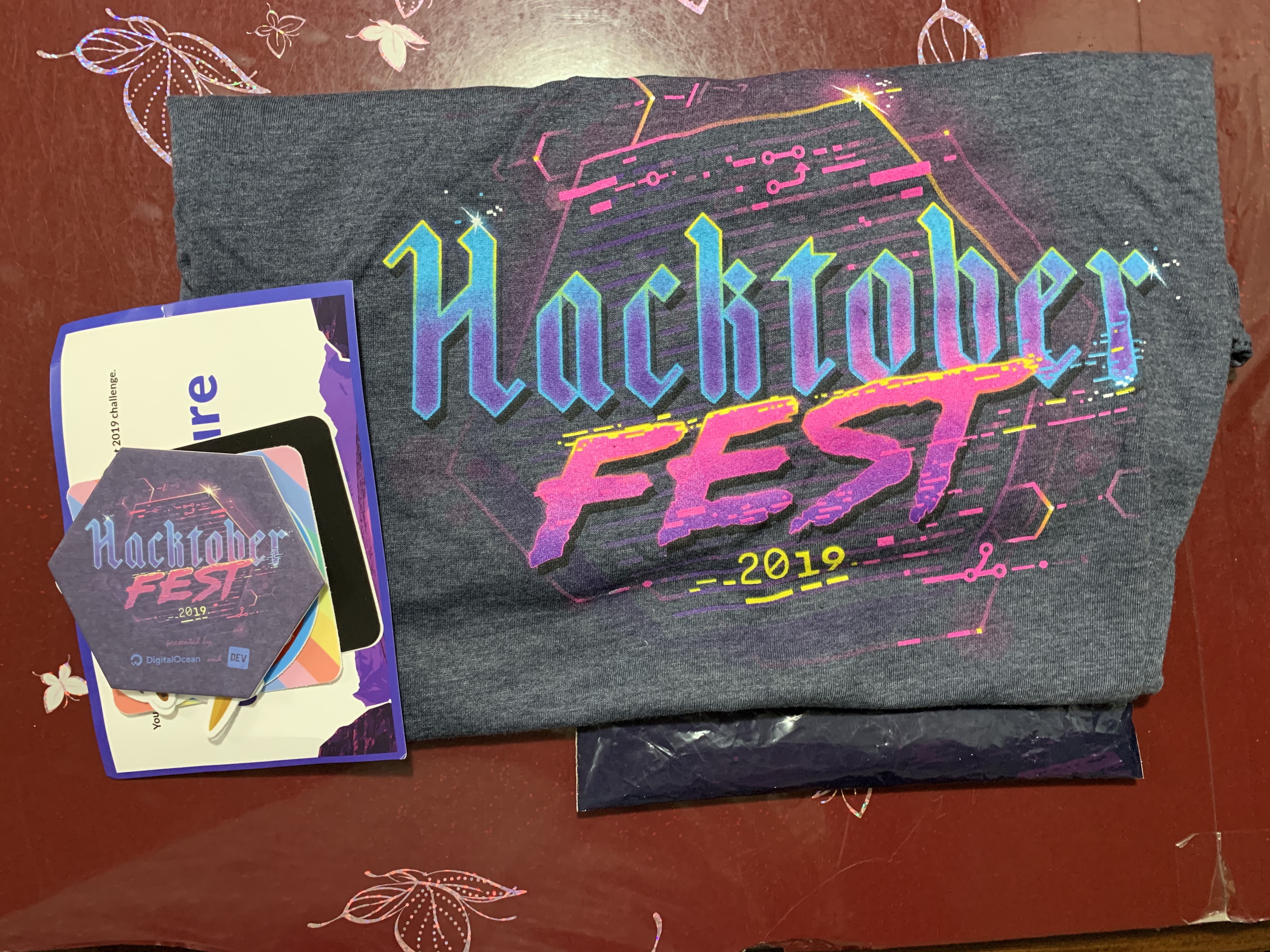 저는 2019년 핵토버페스트(Hacktoberfest) 참여하여, 해가 지난 1월초에 드디어 티셔츠와 스티커를 받았습니다.