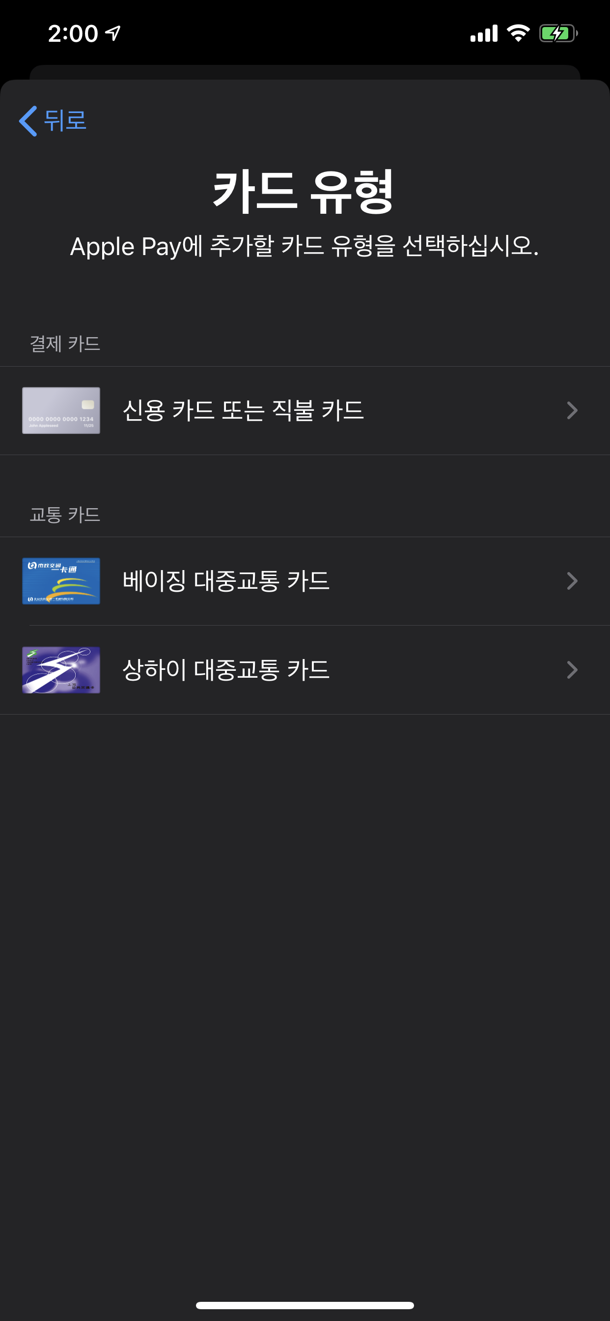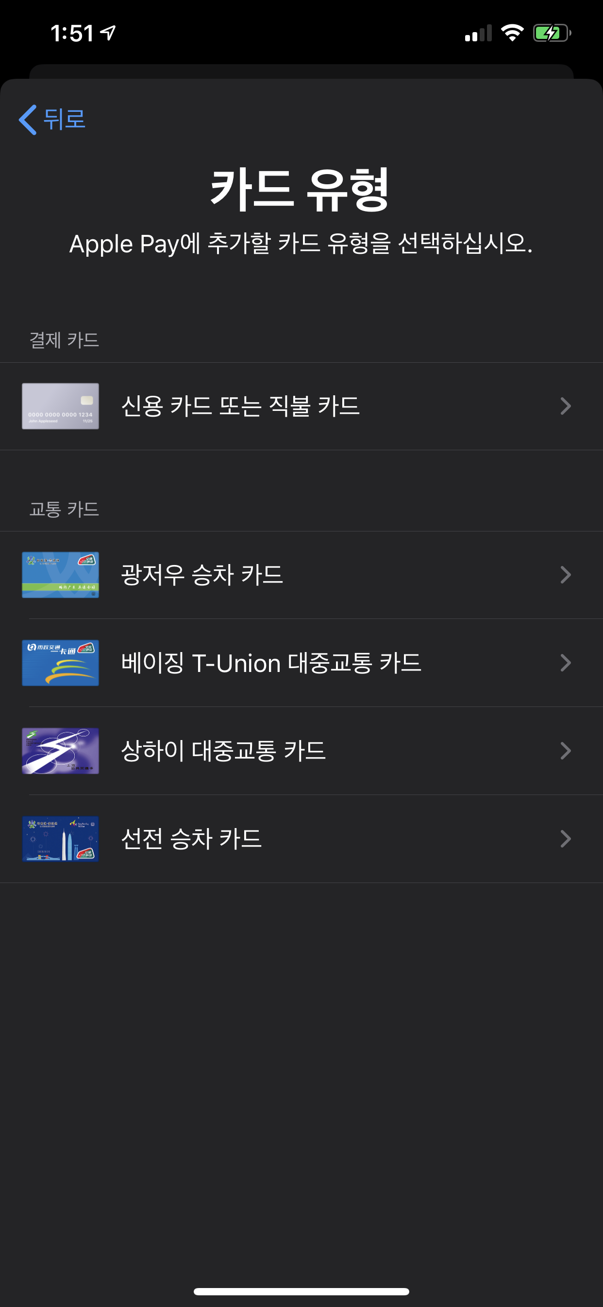 애플페이에서 지원하는 중국지역의 교통카드 4군데
