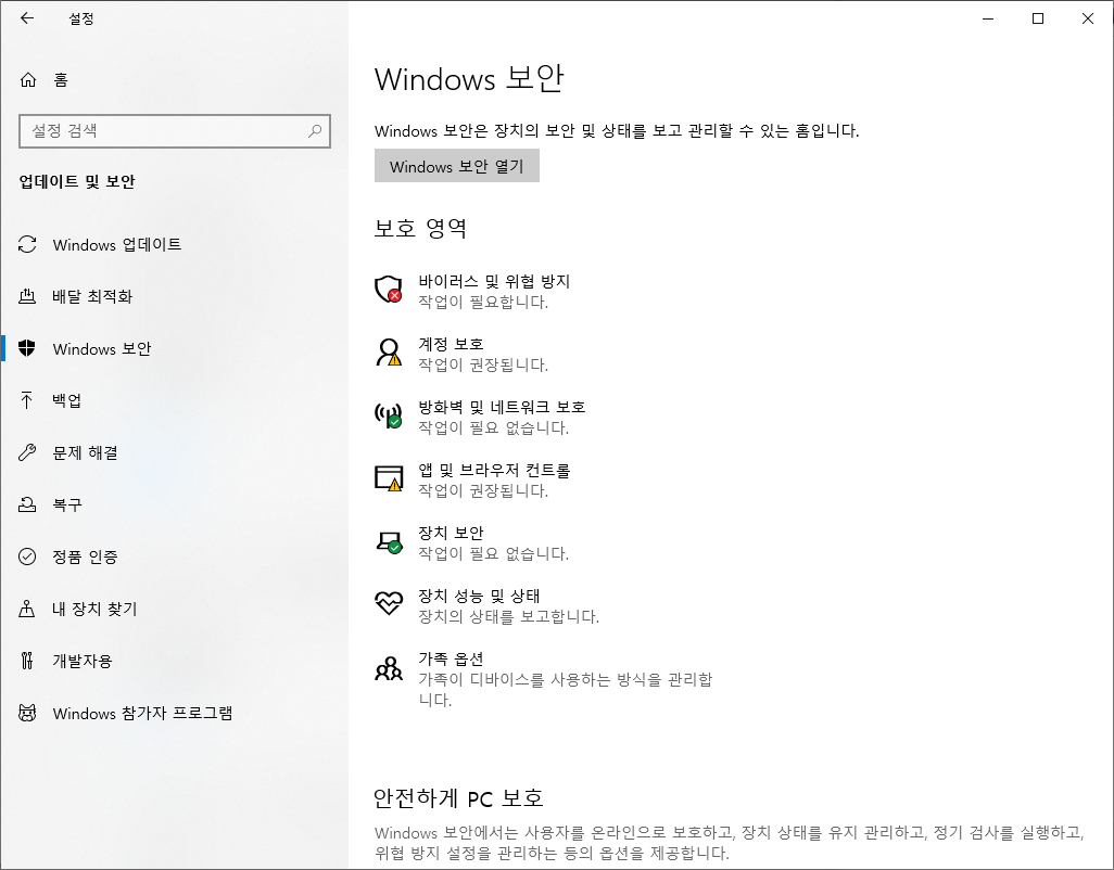 Windows10에서 안티바이러스 끄기는 업데이트 및 보안선택 -> Windows 보안선택 -> 바이러스 및 위협방지 클릭