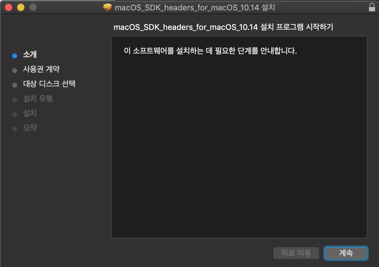 MacOSX mojave(10.14)에서 어플리케이션 빌드를 하기 위해 설정을 해야했음.