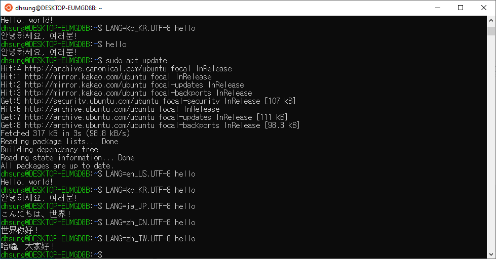앞으로 WSL2가 발전되어 윈도우 언어에 맞게 리눅스 설정이 자동으로 되면 리눅스 개발도 윈도우에서 하는 재미있는 상황이 생기지 않을까란 생각을 해봅니다.