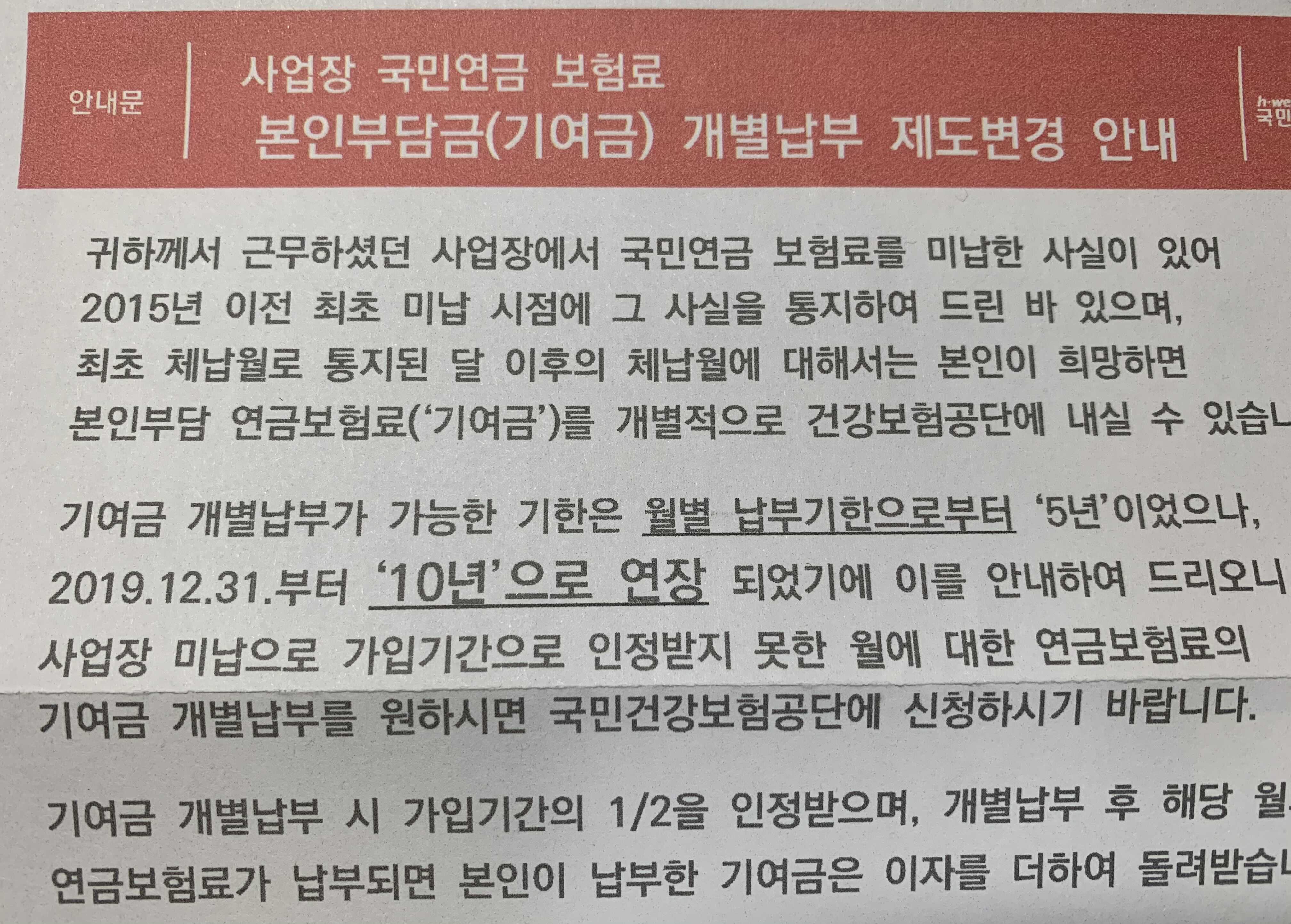 그래서, 국민연금 밀린 7개월치에대해서 생각을 그동안 하지 않은 찰나에, 국민건강보험공단에서 "기여금 개별납부가 2019.12.31.부터 '10년'으로 연장 되었기에 이를 안내하여 드리오니, 사업장 미납으로 가입기간으로 인정받지 못한 월에 대한 연금보험료의 기여금 개별납부를원하시면 국민건강보험공단에 신청하시기 바랍니다"라는 우편을 받았습니다.