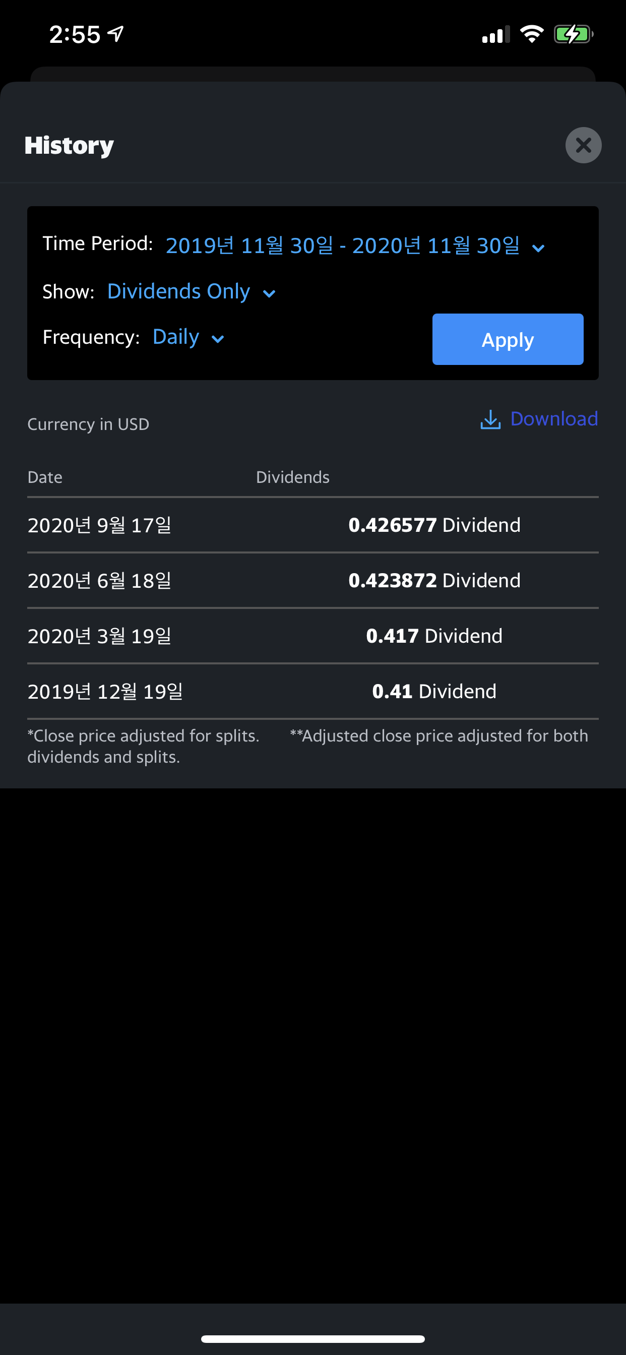 저는 주로 Yahoo Finance앱에서 배당정보를 봅니다.