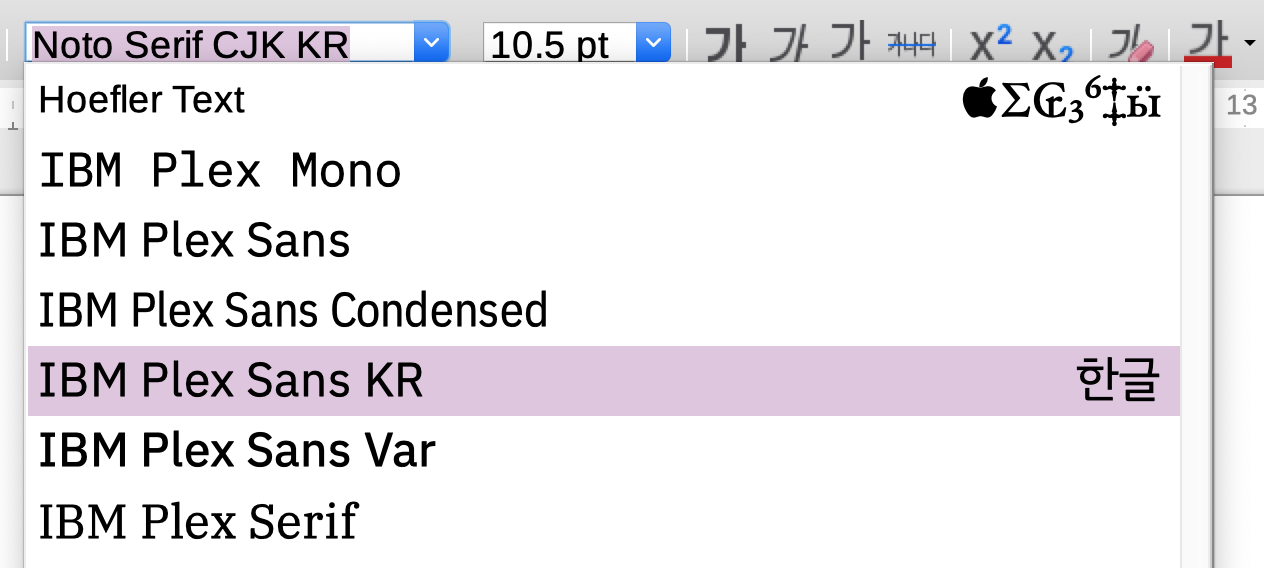 그러나, 오픈오피스(openOffice)최신버전에서는 IBM Plex글꼴에 포함이 안된 글자(code point)등에는 fallback 처리를 하여 렌더링시 글씨가 보이도록 처리하는 것 같더군요.
